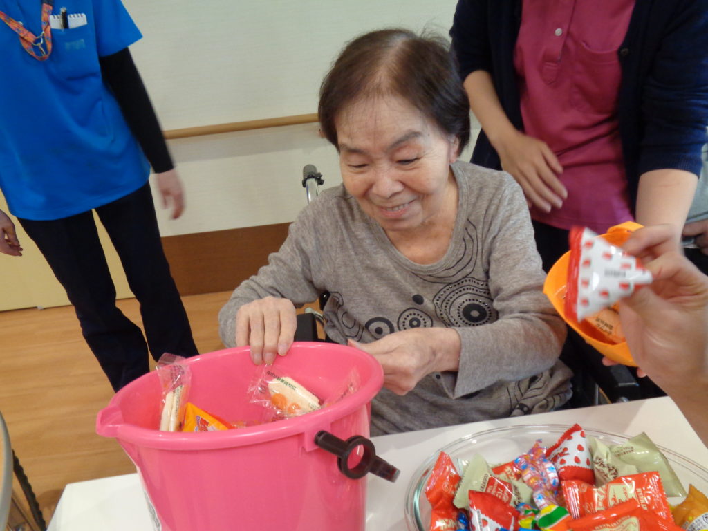 みんなでお菓子のつかみ取りです。