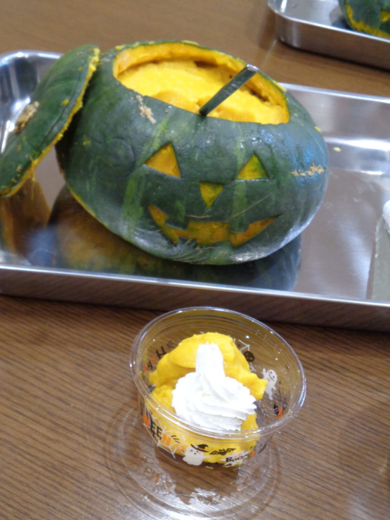 手作りの「かぼちゃプリン」もおやつに食べていただきました。