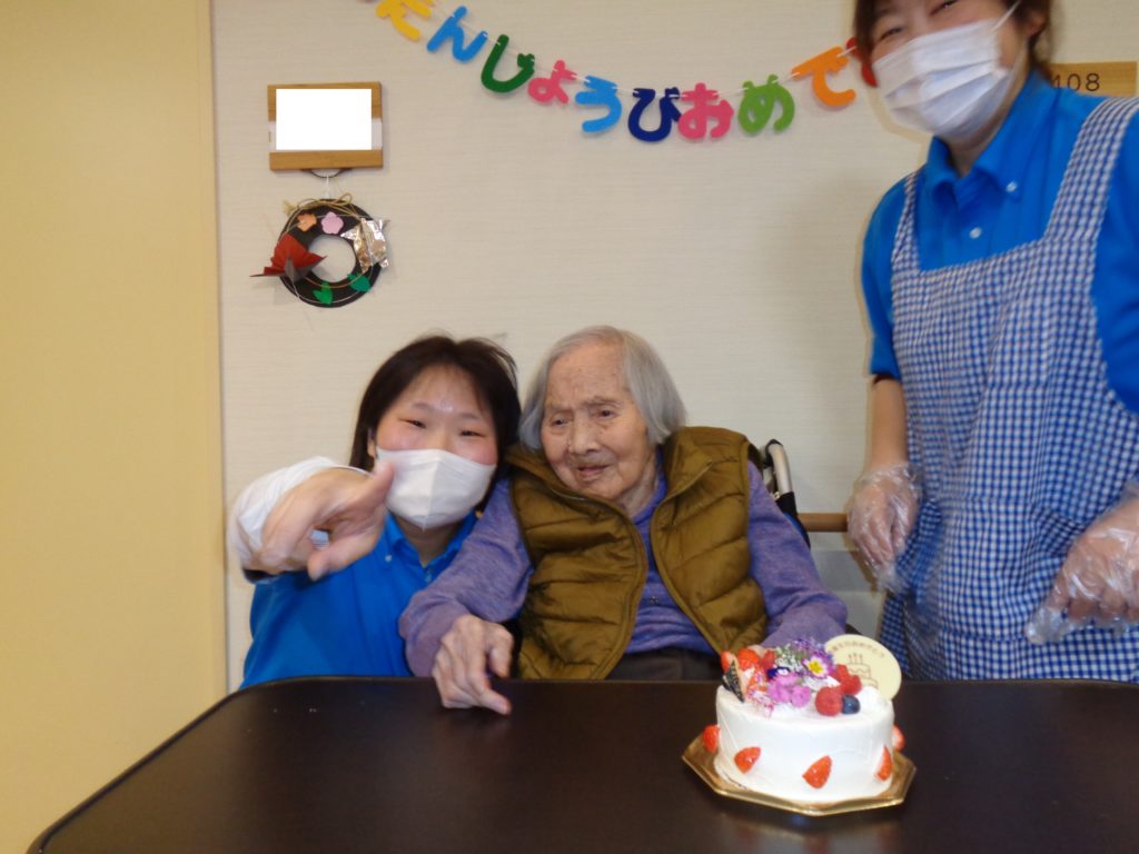 ご家族様からのケーキの差し入れと、施設からのプレゼントでお祝いさせていただきました。