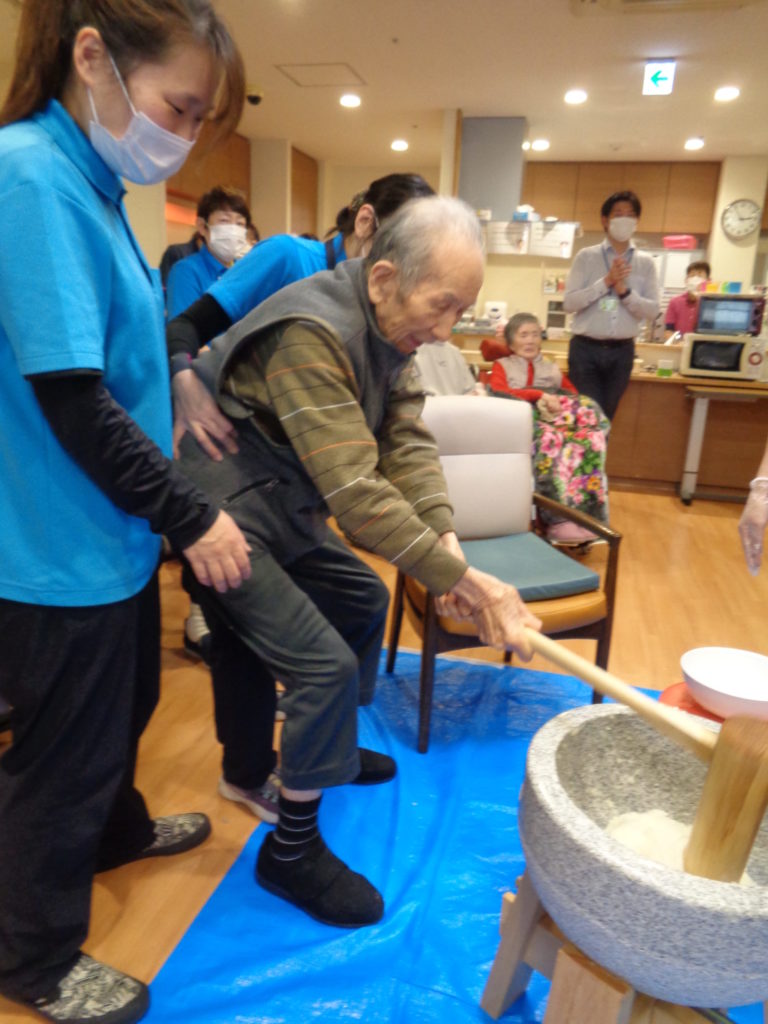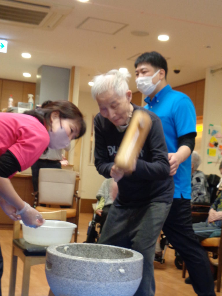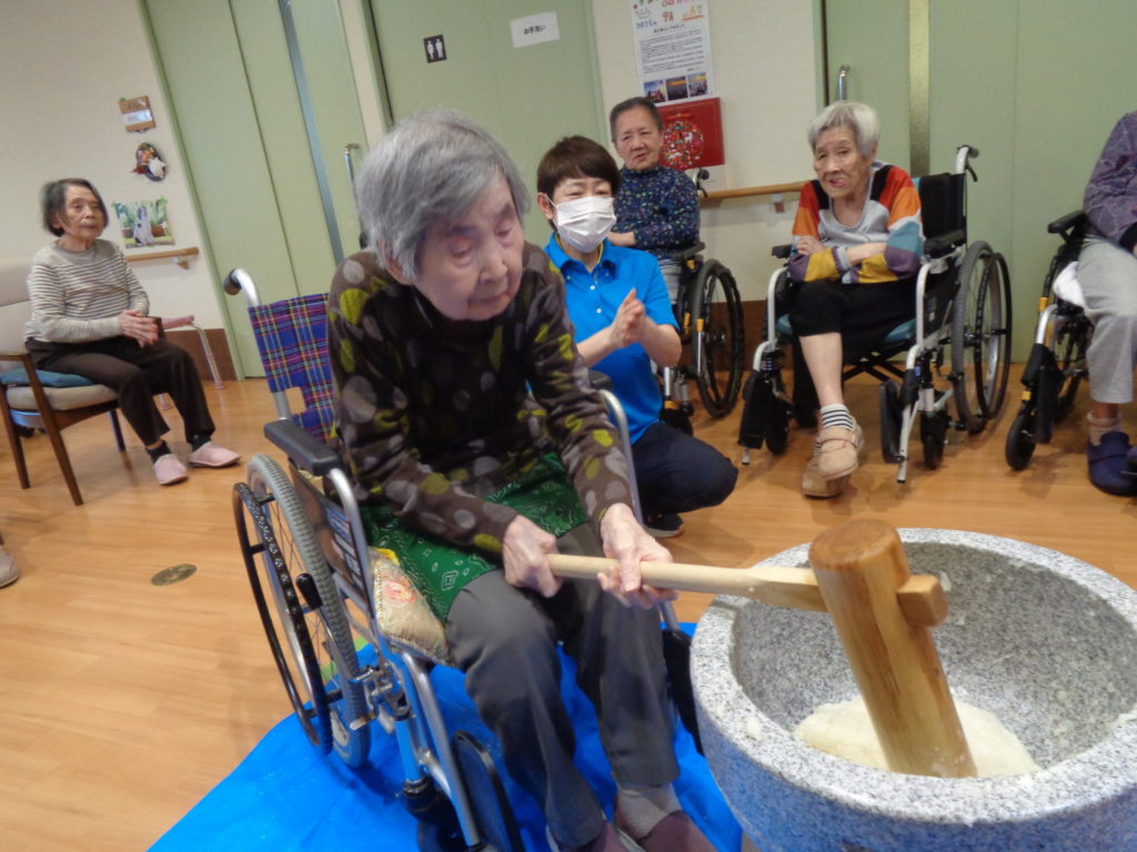 各フロアでお餅つきを行いました。