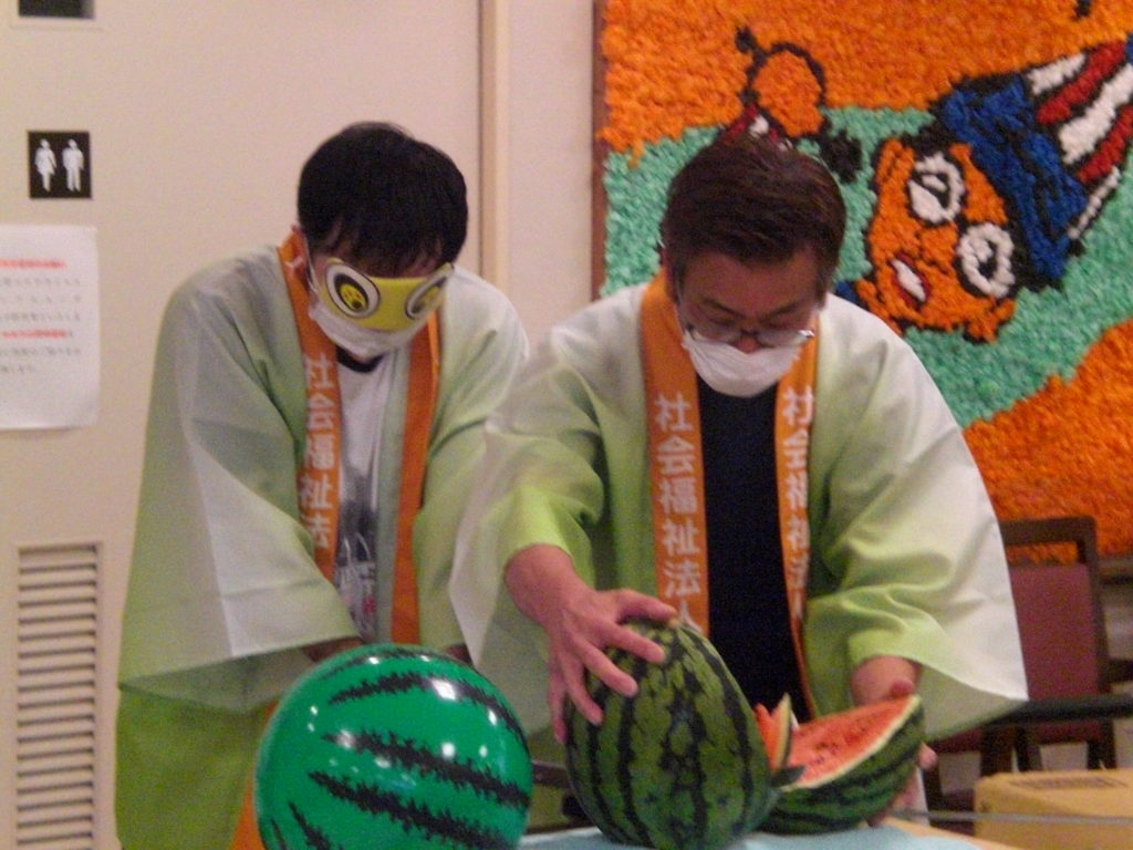 デイサービスは1週間かけてお祭りです。 毎日お祭りのメニューは変わりますが今日はスイカ割りでした。 体を張って切られてくれました。 最後はおいしい本物のスイカを食べていただきました。 -