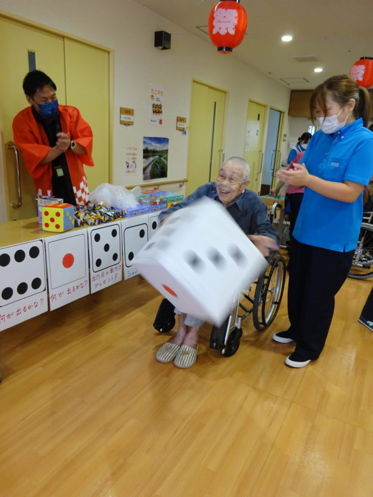 まだまだリスクの高い特養では各階別々の秋祭りです。 緊急事態宣言が解除されましたが T様、大きなサイコロを選んで元気よく投げてくださいました。 H様、普段あまりイベントには参加されませんが、今日はとびきりの笑顔を見せてくださいました。 Y様、参... -