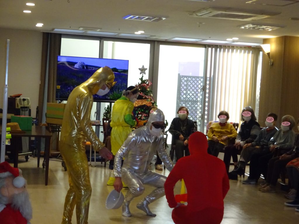 デイサービスを覗きに行ったらスタッフ達がコスプレをしてショートコントが始まりました。 何をしているのか?と尋ねたら「クリスマス会」だとか・・・ ワイワイガヤガヤ楽しそうです。 叩いて被ってジャンケンポン!! -