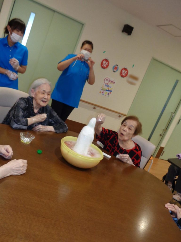 2階のおやつレクは「フルーツポンチ」 炭酸にラムネを入れて、ちょっと楽しいイベントで盛り上がっていただきました。 フルーツのトッピングを沢山乗せて召し上がっていただきました。 4階は「かき氷」です。 味付けはお好きな味付けで楽しんでいただきま... -