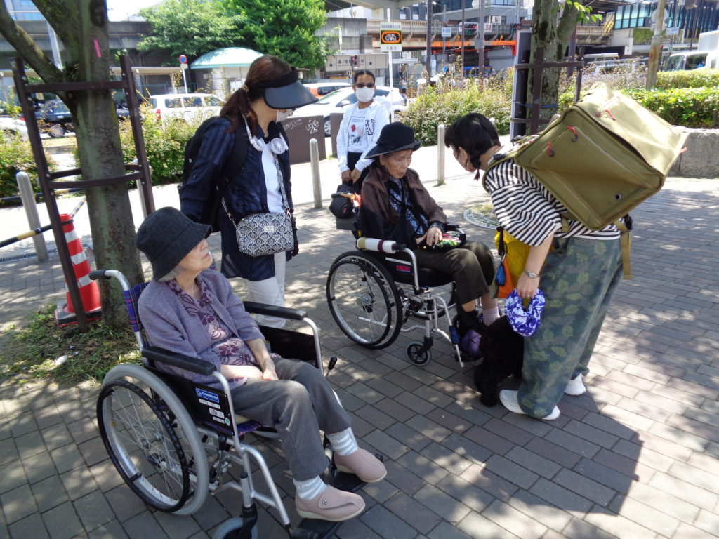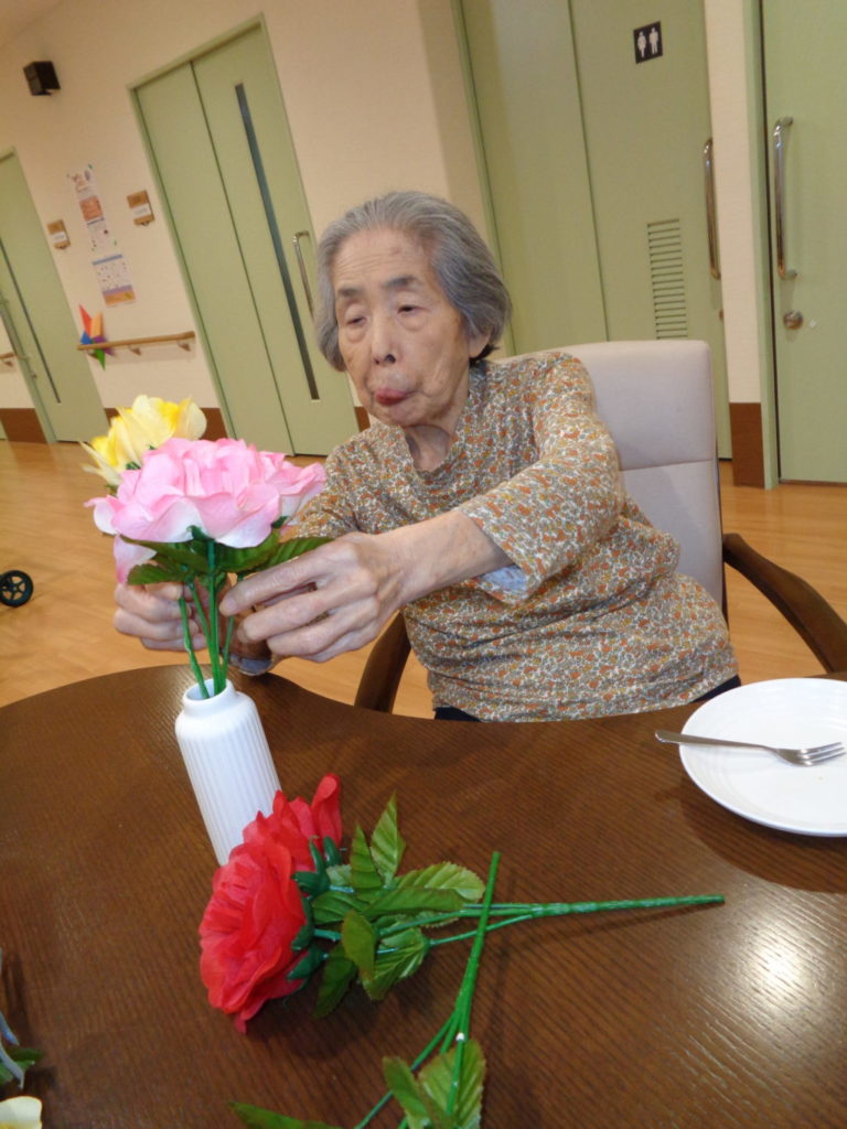 生け花が大好きなT様、造花ですが生けていただきました。 N様も綺麗に生けてくださいました。 興味を持たれたY様は、匂いを嗅いでおられました。 あまりにも可愛らしい様子を見ていたスタッフUさんはメロメロになっていました。 -